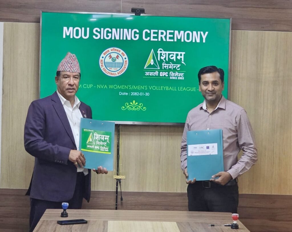 नेपालको राष्ट्रिय खेल भलिबलको लोक प्रियता तीव्र रूपमा बढ्दै गइरहेकोछ । पछिल्लो समय खेल प्रेमीहरूको बढ्दो रुचिलाई मध्यनजर गर्दै नेपाली भलिबललाई नयाँ उचाइमा पु¥याउने उद्देश्य सहित यहि जेठ ८ गतेदेखि १५ गतेसम्म नेपाल भलिबल संघद्वारा पोखरामा आयोजना हुन लागेको छ । 9th PM CUP – NVA WOMEN’S/MEN’S VOLLEYBALL LEAGUE – 2082 मा शिवम् सिमेन्टले लिमिटेड “स्ट्रेन्थ पार्टनर” को रूपमा सहकार्य गर्ने भएको छ ।राष्ट्रिय खेलको प्रबर्धन र समर्थन गर्ने दीर्घकालीन उद्देश्य अनुरूप शिवम् सिमेन्टले यस प्रतियोगितामा सहकार्य गर्न लागेको हो। हालै काठमाडौंमा सम्पन्न कार्यक्रममा नेपाल भलिबल संघका तर्फबाट महासचिव श्री रोशन श्रेष्ठ र शिवम् सिमेन्टका तर्फबाट सेल्स एण्ड मार्केटिबका भी.पी. श्री निखिल अग्रवाल बीच सहकार्य सम्झौतामा हस्ताक्षर भएको थियो ।